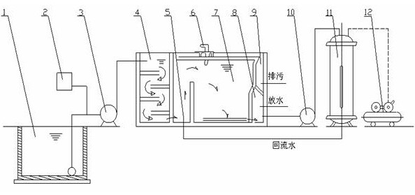 1. 調節池 2. 投凝劑設備 3. 污水泵 4. 折板聚凝池 5. 釋放器 6. 刮渣機 7. 氣浮池 8. 溶氣水存放池 9. 污泥池 10. 溶氣水泵 11. 溶氣罐 12. 空壓機