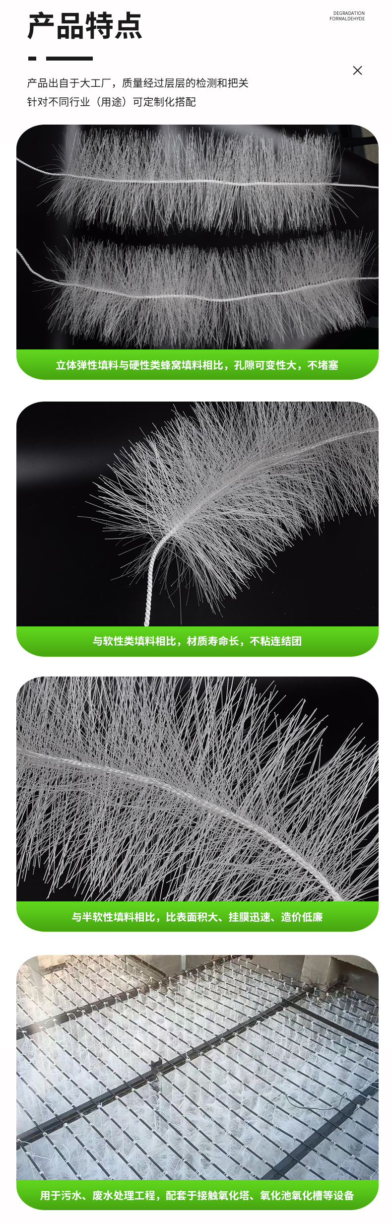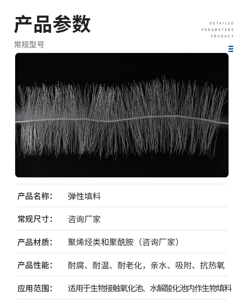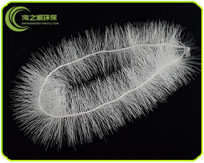 采用特殊的拉絲,絲條制毛工藝,將絲條穿插固著在耐腐、高強度的中心繩上,由于選材和工藝配方精良,剛柔適度,使絲條呈立體均勻排列輻射狀態,制成了懸掛式立體彈性填料的單體,填料在有效區域內能立體全方位均勻舒展滿布,使氣、水、生物膜得到充分混滲接觸交換,生物膜不僅能均勻的著床在每一根絲條上,保持良好的活性和空隙可變性,而且能在運行過程中獲得愈來愈大的比表面積。