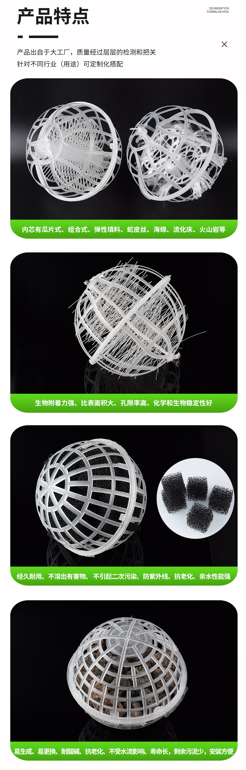 球形懸浮填料,又稱多孔旋轉(zhuǎn)球形懸浮填料,是對國內(nèi)處理污水、生物膜法處理技術(shù)采用的多種填料中開發(fā)的新系列產(chǎn)品。在污水的生化處理中具有全立體結(jié)構(gòu),比表面積大,直接投放,無須固定,易掛膜,不堵塞。