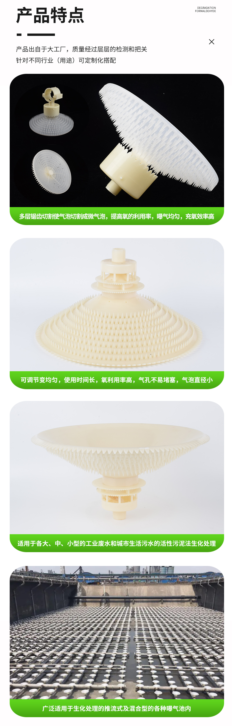 旋混式曝氣器采用多層螺旋切割的型式進(jìn)行充氧曝氣,旋混式曝氣器當(dāng)氣流進(jìn)入260型混流型曝氣器時(shí),氣流首先通過二道螺旋切割系統(tǒng),切割后進(jìn)入下層的的多層鋸齒型布?xì)忸^,進(jìn)行多層切割,使氣泡切割成微氣泡,這樣大大提高了氧的利用率,具有布?xì)饩鶆颍溲跣矢叩奶攸c(diǎn)。